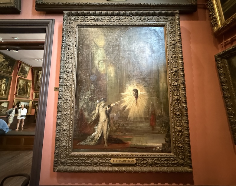 3階(日本4階)の静かな一角にひっそりと飾られていた”L’apparition”(出現)は、強く心を惹かれた一枚。画面中央、白く光る聖なる幻影のように浮かぶ首とサロメのまなざしが、緊張感を生んでいます。