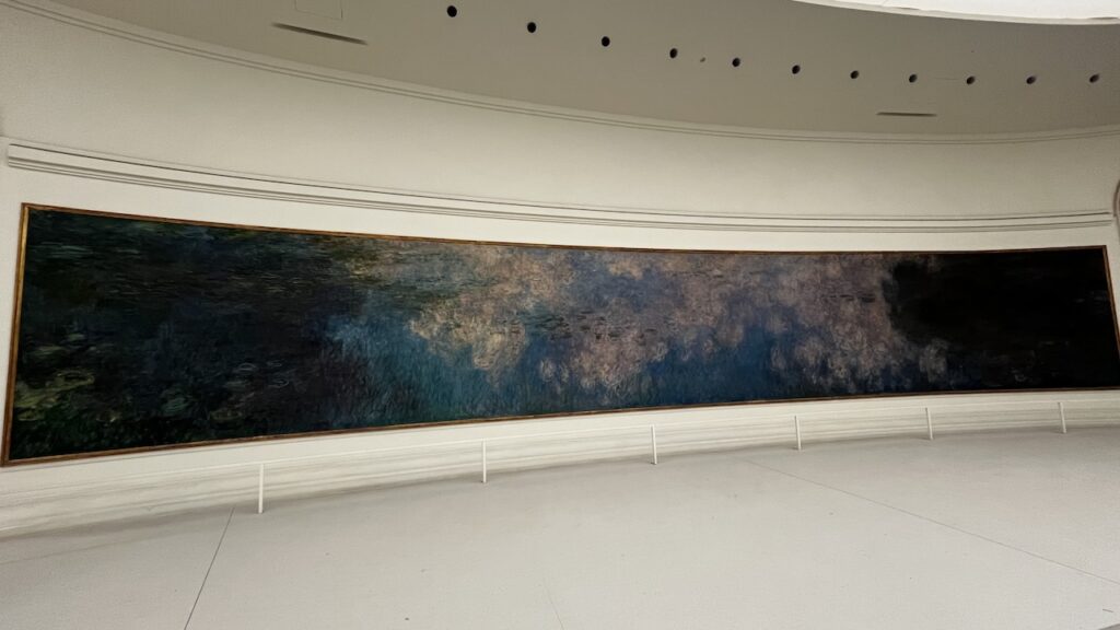 作品の前に立っていると、色彩が脈打つように広がり、光のなかに溶けていくような感覚になりました。時間を忘れ、ただ自然の光によって変化する睡蓮の池を眺めているような、まるで瞑想の世界にいるかのようです。